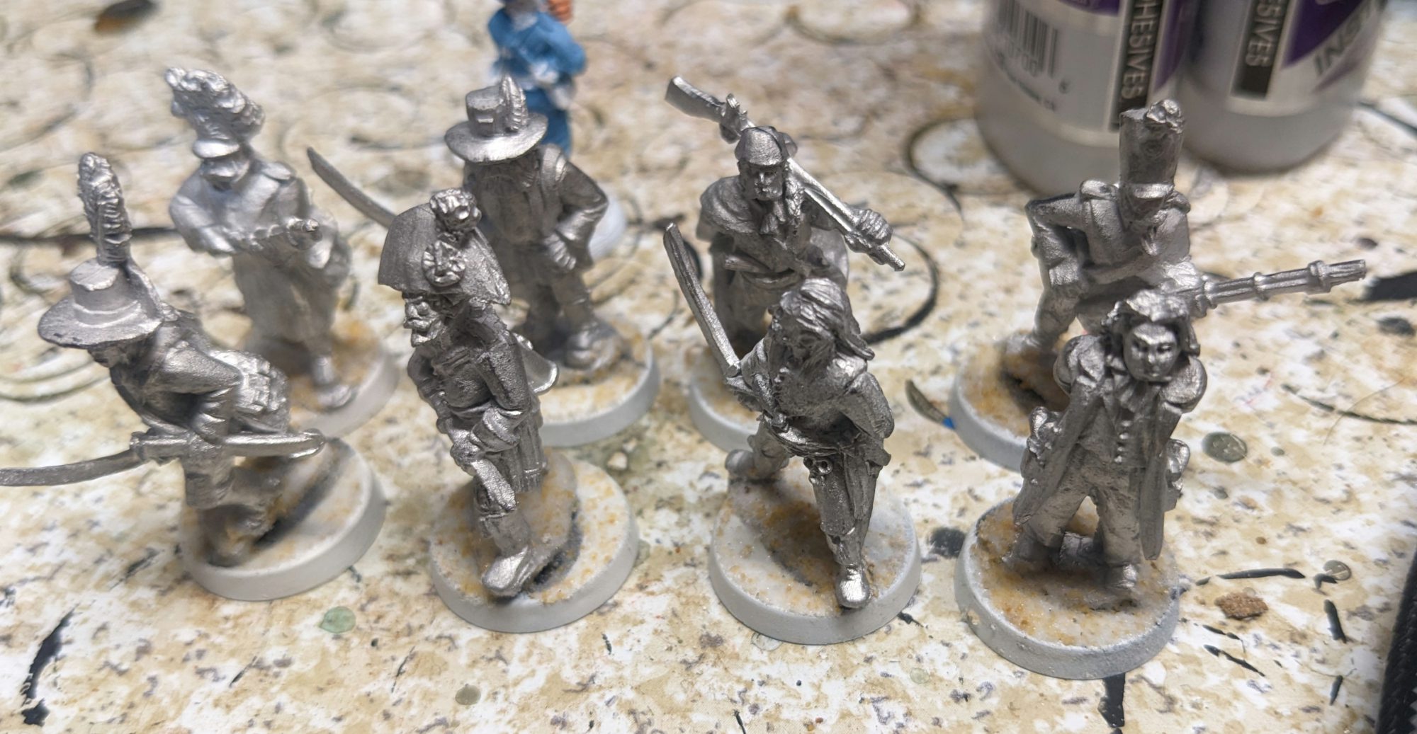 The Austrian unit for The Silver Bayonet. Credit: Michael O "mugginns"Once you've chosen your basing scheme, it's important to take your minis out and look them over. You can see on my minis above that the guy in the top left has a kind of plug or something on the end of his musket - it's an artifact from casting, how they pull it out, I assume. Nip that off then nip off any other flash on the minis (you can see it on the ones above, the flash is the extra metal that is leftover from when the minis are pulled out of the mold).