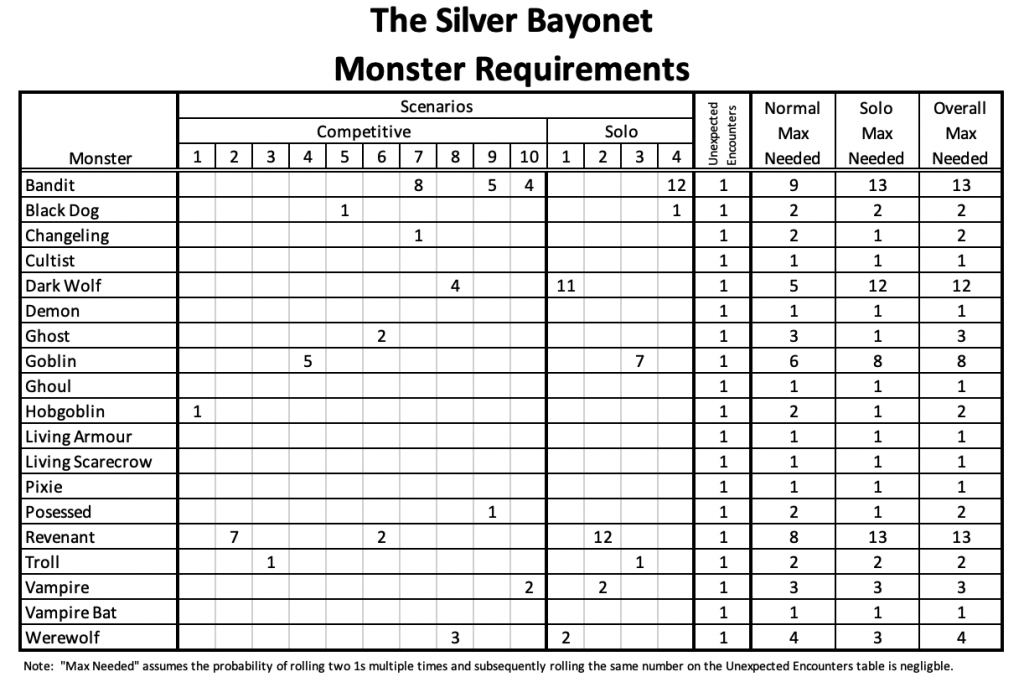 There are a lot of different monsters available in the scenarios - what I would suggest is maybe pick out a dozen monsters you'd like to face and start with those. It might be five bandits, two black dogs, and five dark wolves. This was uploaded to the Facebook group that shows you what you need to do the scenarios from the main rulebook: