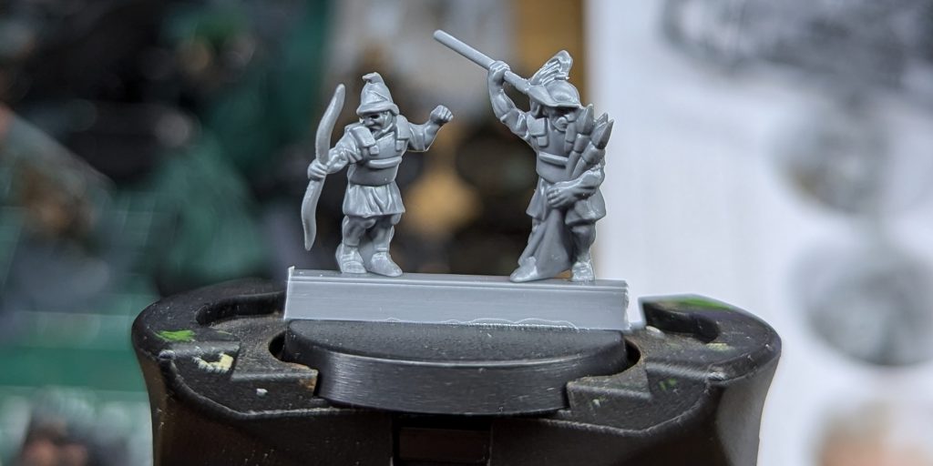 I originally intended to paint more than just three units, but seeing how I haven't really painted small scale before it was inevitable that I would run into some issues. My first project was obviously the elephants. When assembling them, it's smart to put them in sub-assemblies. As you can see on the photos, I assembled the elephants and their howdahs and then put each on their own temporary base. You can make use of their little peg and put it into a slotta base, while adding a little super glue to one of the other feet. The crew was a different story, while you could absolutely put them on temporary bases there's issues. The two pikemen obviously hold their spears lower than their feet, so I needed to angle them in a way that the spears wouldn't go below the base. For this I cut out two small pieces of sprue with an angle on one side and then put them on the base as shown below.