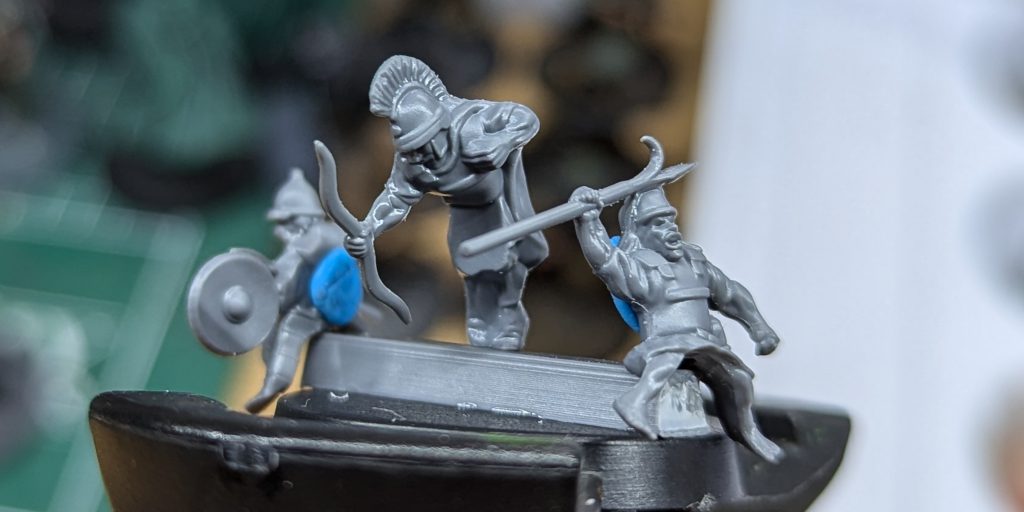 Next up to paint were some Roman Velites. These Caesar's Legion lookalikes are the Roman skirmishers, which means some freedom in how you put them on the base. When assembling these I noticed, there's more holes on the base than there are minis to put on it, so you'll need to do some gap filling there. I wanted to try out some different skin tones and some skin effects on these guys (as my elephant crew was all just white guys). I opted to also paint some of their tunics in different colors to add to their scattered nature as skirmishers. The biggest hurdle I faced when painting this unit was the wolf fur two of them are wearing, trying to paint a decent looking fur at that scale is really difficult