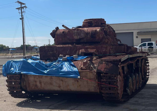 Tarped tank. Credit: IlorI’m ready to turn my back yard into Bovington. Some day. Some day…