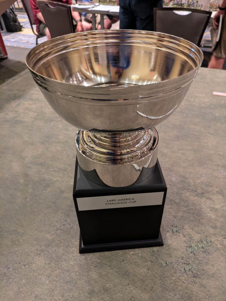 The Lard America Challenge Cup. Credit: MugginnsOur club runs four or five games per time slot - usually two time slots in one day. We have a corner of the main upstairs ballroom with all of our games right in the front when you walk in.