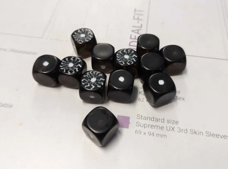 Konflict 47 Rift Dice. Credit: MommaNeganRift Dice are d6s like Order Dice, but with three faces showing Exhausted, two showing Active, and one showing Surging. Each unit with Rift Dice starts the game with them set as Active, and comes with a special ability that they can use while they have an Active Rift Die. If they use that ability (e.g. US Firefly squads can use theirs to move, shoot, and then move again), then the Rift Die becomes Exhausted and they suffer a penalty (e.g. Firefly squads lose the flight special rule). If a Rift Die is Surging, then it gets an extra buff, and when you spend it to use your ability it becomes Active instead of Exhausted. All Exhausted Rift Dice are re-rolled at the end of each round, and if they still come up Exhausted then they’re placed back in the dice bag with the Order Dice. If you draw one of your Rift Dice from the bag then you can roll it and assign it to one of your units that’s missing a Rift Die once you see what face it lands on. Similarly, if you assign an Order Die to a unit that doesn’t have all its Rift Dice then you pick one out of the dice bag, roll it, and assign it to that unit.