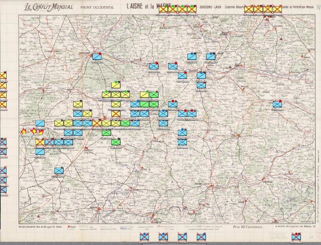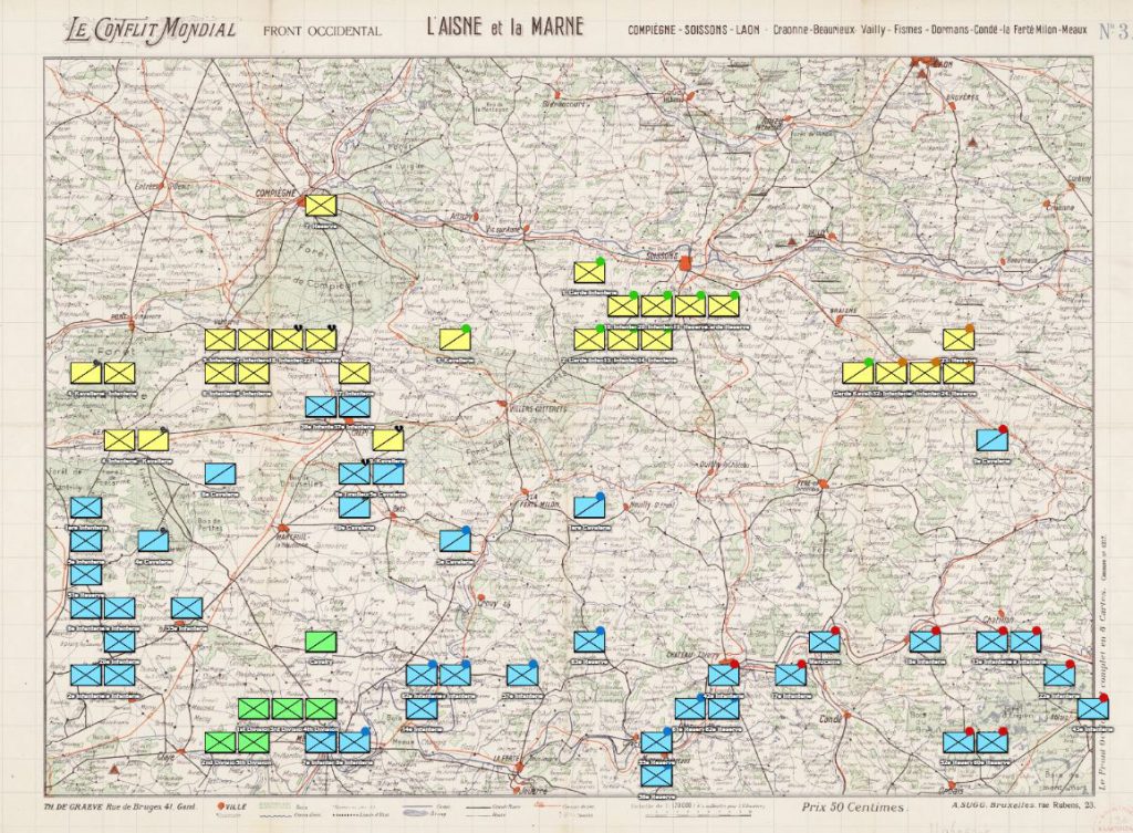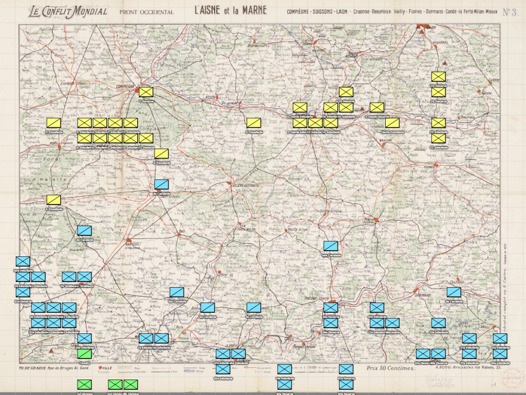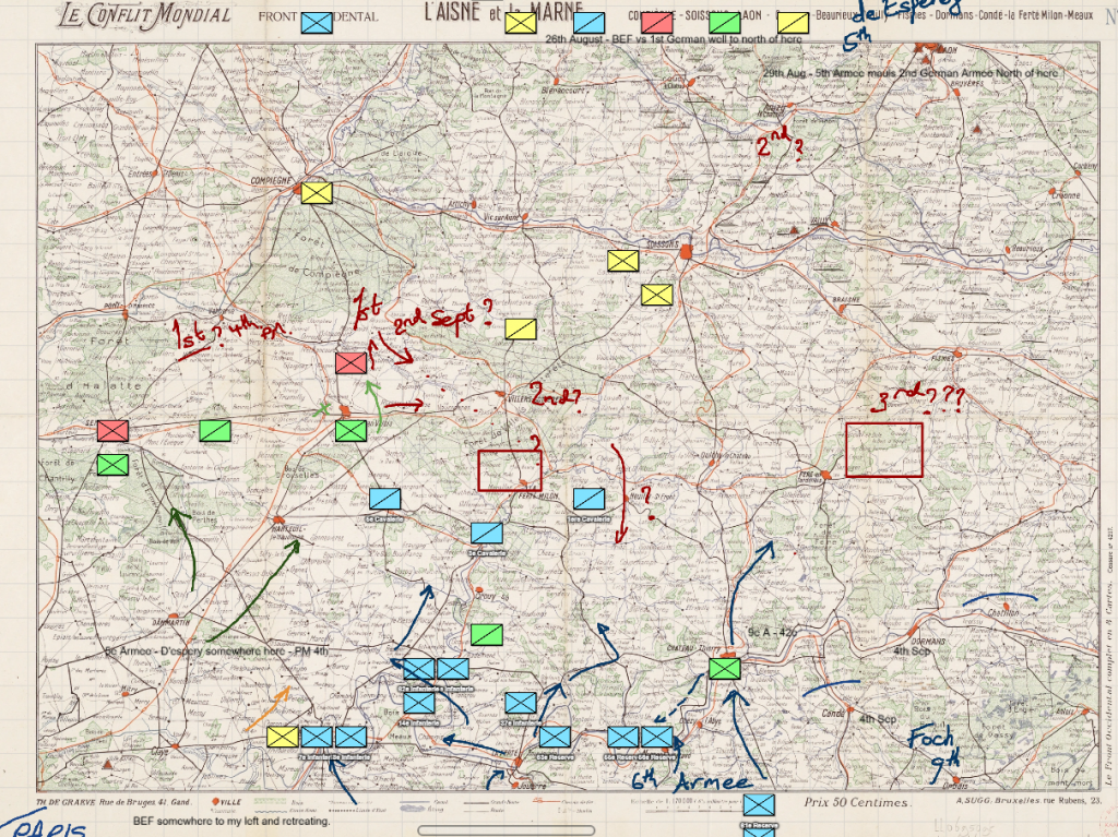 By this point, that village of Crépy had seen a shocking amount of combat - have a look at the left hand side of the map there for the ‘dead pile’ of divisions that had been fed into those few squares of map that were no longer combat effective. Both von Kluck and d’Esperey had pulled forces off of the line here, shocked at the speed of the bloodshed, and were searching for a way around each other.