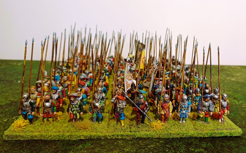Block of 40 pike Credit: Jackie DaytonaFirst things first: the history. I set out to get some Osprey books about the period (roughly late 1400’s -1600’s) which would serve as primers so I could get a better grip on this piece of history. I love Ospreys for this. They’re clear, won’t get you bogged down in too much detail, and because they’re so specific, give a great overview. Because we’re also living in the future but less exciting and a bit more depressing than we want it to be, I also used as many online resources as I could. I don’t think you have to actually do this if you’re playing historicals by the way. Enjoying these games and models doesn’t have to be homework if you don’t enjoy it. But I like reading and I’ve never encountered a period of history that wasn’t interesting for some reason. This is why I also enjoy going out sometimes to stare at a field and go “wow, cool” because something interesting happened there 500 years ago.