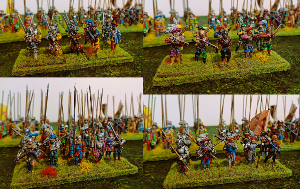 Doppelsöldner, Handgunners, mixed pike block and Halberdiers Credit: Jackie DaytonaI tried to give a more or less accurate representation of how this would look on the battlefield. Now, this is where there’s some ambiguity about the strength and number of men in a pike block. The Swiss used flexible 100 men affairs, ten rows deep, with some halberdiers sprinkled in to fill up gaps or exploit gaps in the opposing lines. But there are records of larger formations and blocks of a thousand men or more. The typical Landsknecht company or Fähnlein consisted on paper of about 400 men, subdivided into “Rotten” or units if you will. The back ranks were made up of experienced or veteran troops. Banner bearers were put in the middle, as a rallying point and within easy shouting distance.