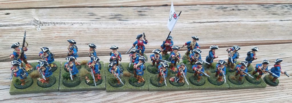 So with 55 points, using the FIW force builder from Sharp Practice, you should be looking at anywhere from 25 models (a small force focused on ambush and skirmishing) to upwards of 50 models (conscripted provincial line infantry with some skirmish support). The highest status we’ll use is III. From the UK games days I’ve seen, a good rule of thumb is 16-22 points on Leaders, Musicians, support, etc. Try to bring units that are somewhat historical together. Here are some example forces below:
