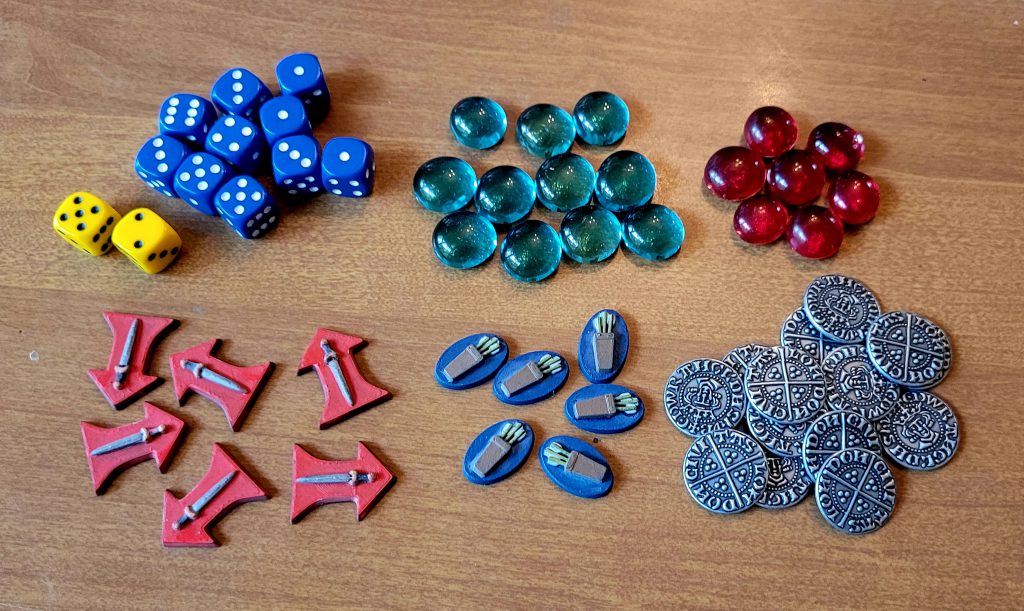 3D printed tokens with other markers. Credit: TubaGlueYou will also need various tokens to help with keeping track of the state of the game. The full color tokens from Too Fat Lardies and their STL tokens don’t cover all the required tokens, so I’ll include a few suggestions here: