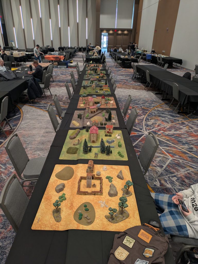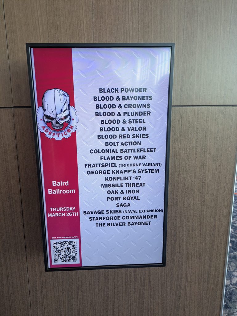 AdeptiCon has these sweet signs showing all the games going on in the hall you're at. Credit: Michael O "mugginns"The other focus for my preparation is just getting everything we'll need for Wednesday through Sunday. I have a text list on my Drive and I copy it over from year to year (I have a folder for each year with all the documents I need for each AdeptiCon) that includes pretty much anything we'll need for the week, from medicine to models to terrain to clothing. My anxiety makes it so I really don't want to forget anything. Two years in a row (back in the day) we forgot our SAGA sticks and fatigue markers - it was bad!