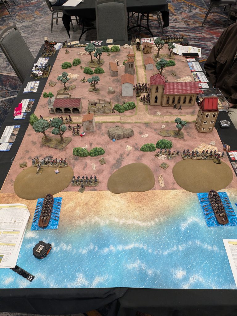 Surfboats hit the shore. Credit: Michael O "mugginns"Our scenario was part of Winfield Scott's campaign to take Vera Cruz. His plan was to land on the coast and take strategic points as well as take supplies. For this particular scenario we had two surfboats landing with sailors at the coast. Once they had landed (after the turn of a few blank cards) then the US soldiers could deploy from those boats as their deployment points. The Mexican defenders could move and deploy while the boats were rowing, trying to get into position. They could post the Mexican flag on the church in town to call in reinforcements.