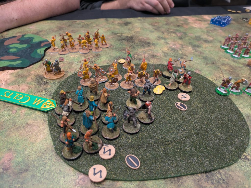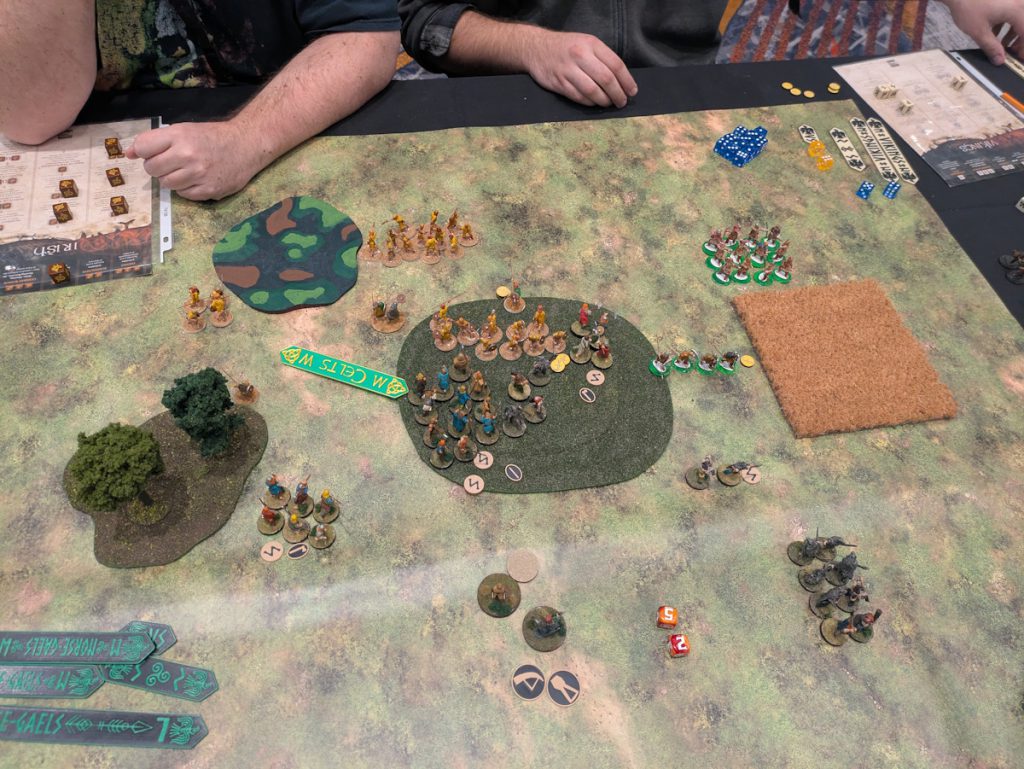 Fighting on the hill in the third game. Credit: Michael O "mugginns"Overall we had a great time. Game one we faced off against Last Romans and Anglo-Danes. It's been a while since I played against Anglo-Danes - they're tough! The Last Romans are great at shooting and really ground us down. In the end we tried some late-game Warlord runs that didn't work out. We lost game one but had a good time. SAGA is a game where you have to plan out your turn, obviously, since you have to put all your dice down and then think about what you're doing. Norse-Gaels are definitely about powering up a dice machine - and if you do a step wrong or out of turn then you can screw it up. I definitely screwed mine up the first or second turn, probably both. The first scenario has us fighting it out in the middle with a champion, while our guys nearby would fight and score points for kills.