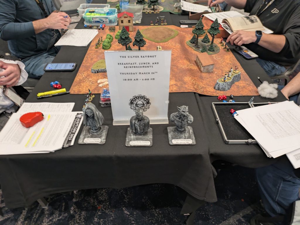 Silver Bayonet games ongoing. Credit: Michael O "mugginns"This year I wrote up the three-game campaign mostly adapting scenarios from the campaign books that have already been released. I based it heavily on the movie Ravenous, starring Guy Pierce and Robert Carlyle (and David Arquette!). After each game the players learned more about their companion, Carlyle, and how he was a cannibal, and how he was getting stronger by eating more people and how their soldiers could as well.