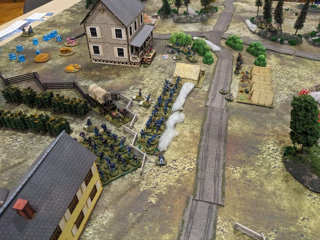 The 2nd North Carolina Battalion (freedmen and former enslaved people who joined the Union Army) opens up on the Confederates. Mugginns' Sharp Practice game at FlintCon.I may actually make the Federal forces the ones who have to get to the boat. They have more men and better leaders - they should definitely be attacking and trying to move up the board. I'm also going to spread the trees out a bit so that forces can move around a bit easier. The two Federal main formations got clogged up and weren't able to spread out.