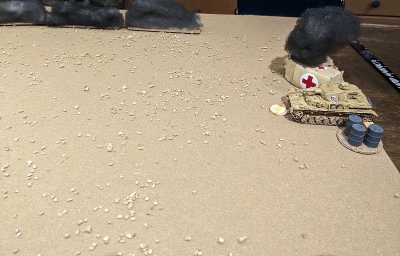 Again there will be four burning wrecks on the table at the beginning of the game. One of these ends up being very close to a table edge, and this time the wind is blowing straight down the battlefield from north to south. This will give long lanes of fire down the table, but make it hard for units to fire across the table. As it turns out, this would become important.The three objective vehicles were a supply truck, an ammunition truck, and a troop transport. After randomizing their starting positions, this was the state of the table at the beginning of the Patrol Phase: