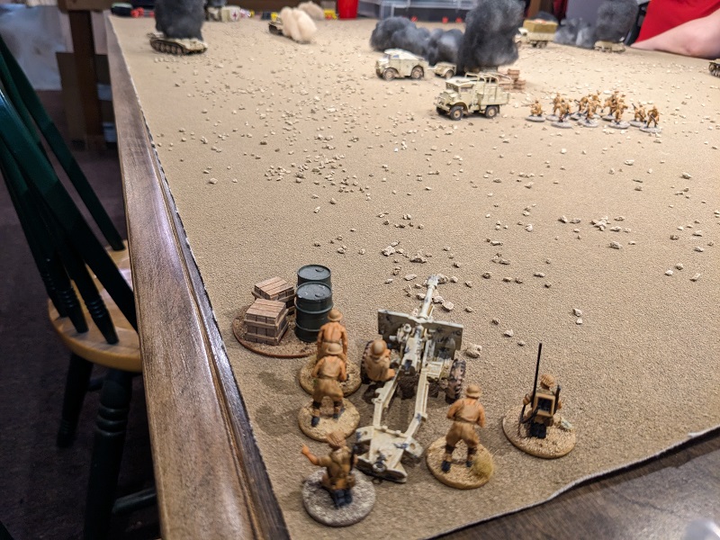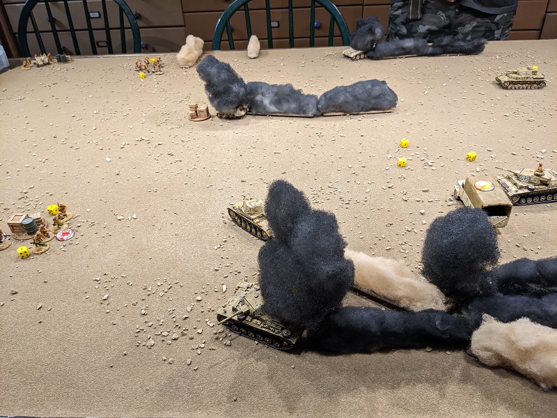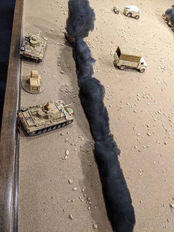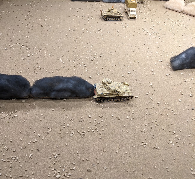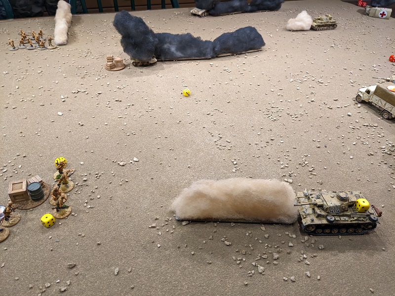 After taking a round from the 25-lb gun, the Panzer IV in the distance kicks it into reverse. (credit: Ilor)Turn 2, Phase 2 (German): 553322 - Wasted Red Die aside, this was another great roll for the Germans. Ehrenreich took his mandatory engagement action at 2nd Section, putting a kill on the Bren team and a kill and a Shock on the rifle team. Unfortunately, one of those kills turned out to be a wound on the section's lance corporal - he was wounded and lost a CI. South African Force Morale took a tumble to 6. Next, the Pz II deployed and also unloaded on 2nd Section. It only had line-of-fire to the rifle team, but it inflicted another whopping 2 kills and 3 Shock. This put them one point shy of being pinned, but at least no further leader hits resulted. Via radio, Krauss ordered the Pz IV D to take a shot at the ammo carrier before it escaped. When that shot missed by a wide margin, he ordered his own gunner to engage it, though obscured by smoke this shot also missed.