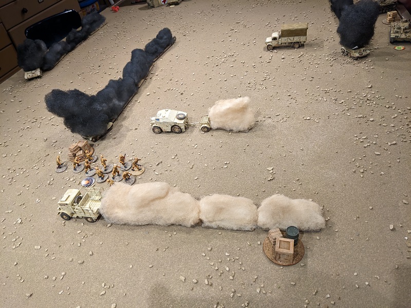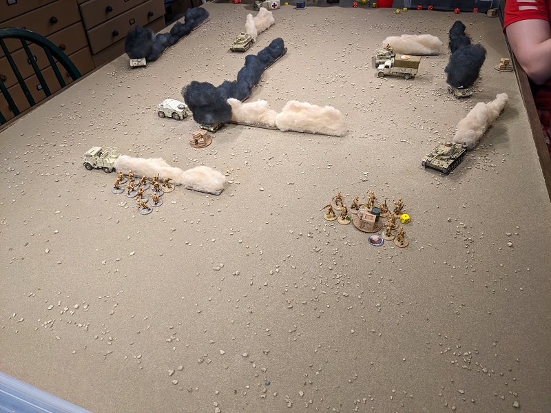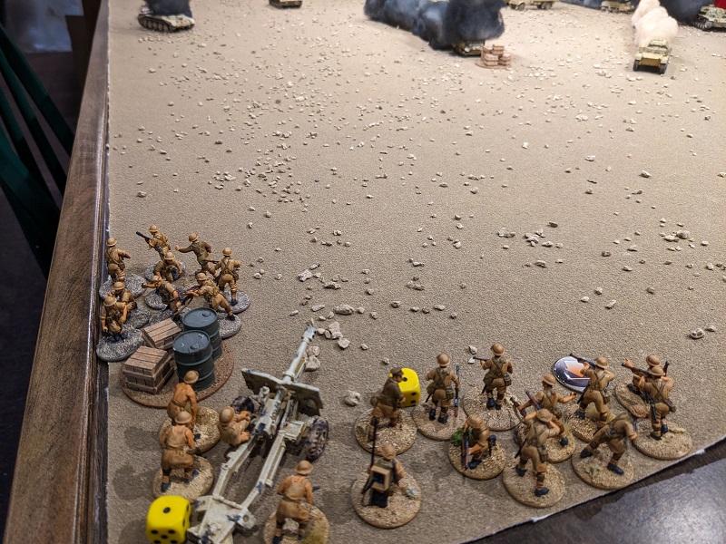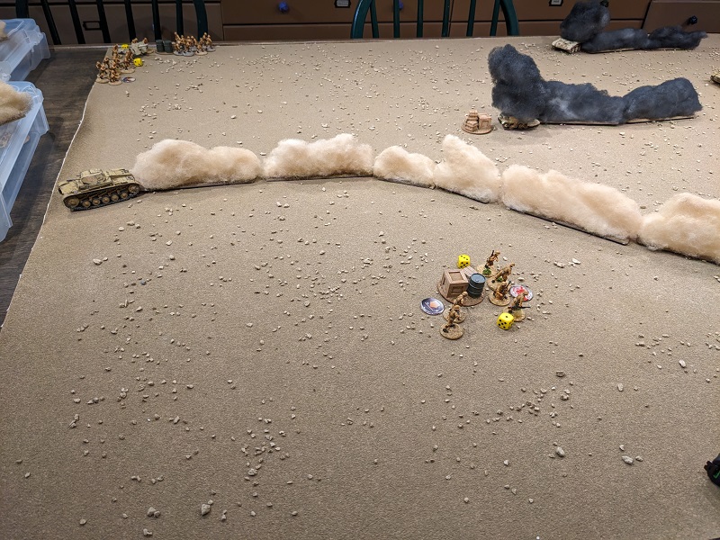 Turn 2, Phase 6 (South African): 54422 - with a regular senior leader still in reserve, John deploys him now, along with 3rd Section (also upgraded to regular). One of the newly deployed lieutenant's CIs is spent getting the men of 3rd Section sorted (deployed in tactical stance). This is a regular infantry unit pulling close security for the gun crew and another is spent ordering the 25-lb gun to fire. It takes a shot at Krauss' command tank, but the obscuring smoke throws off the aim. Finally, Borenhaas rallies two Shock off his clerks and has them hoof it. They move 11", cleanly crossing the artillery gun's line of fire.