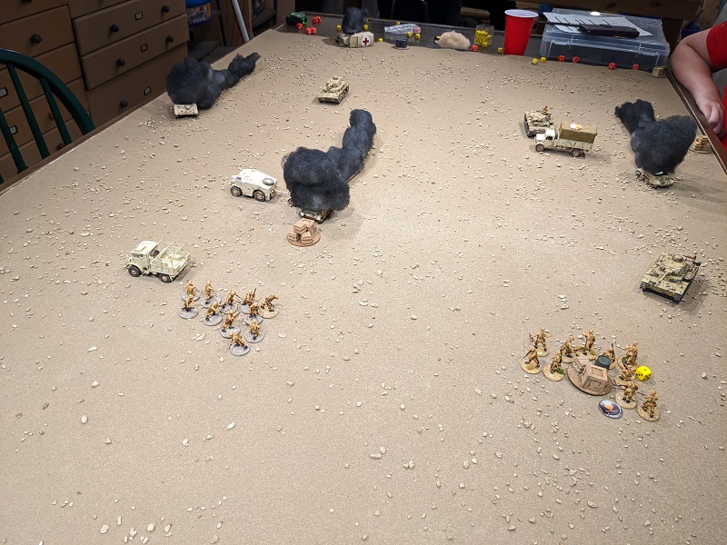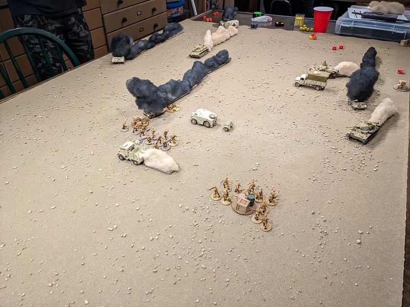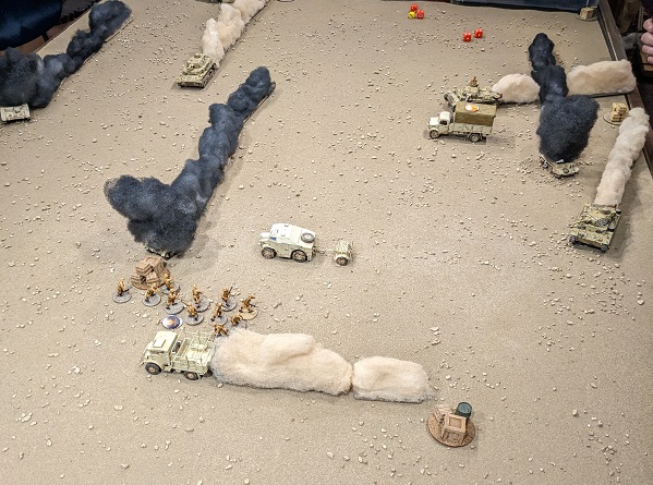 The state of the board after the end of the first Turn. When all of dust clears, things suddenly look a hell of a lot scarier! (credit: Ilor)Turn 2, Phase 1 (South African): 5543 - The 25-lb gun deployed from the Allied JOP in the northeast corner of the board - it's not like range was going to be an issue - and immediately took a shot at the Pz IV D. Unsurprisingly it scored a hit, but Lily's armor save roll was miraculous. Still, it resulted in a roll on the "0-net hits" table, and the big tank added a point of Shock and was forced to reverse. The 4 was spent activating Borenhaas, who concentrated on keeping the trucks and supply clerks all moving, with the supply truck actually making it off the table to safety.