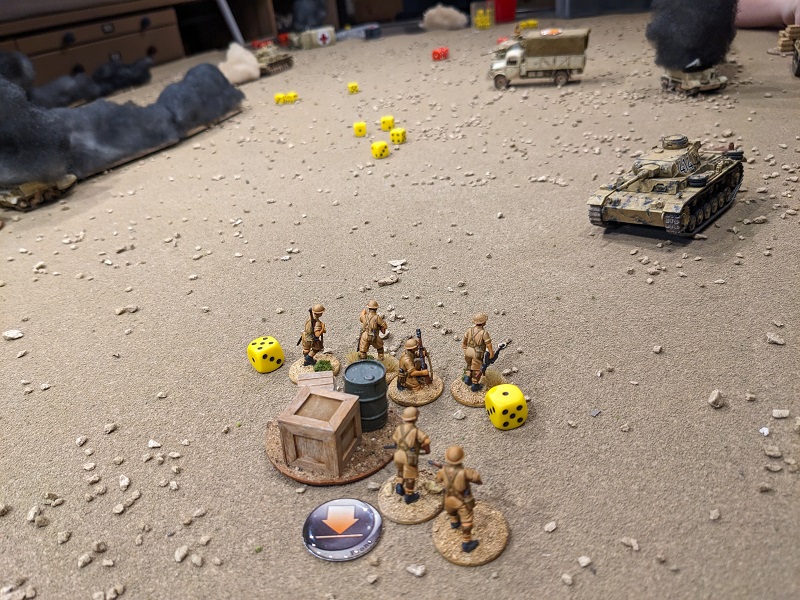 Six men and 6 Shock, not a good sign. One more point of Shock and this unit is pinned! Worse, this phase saw the unit's Junior Leader lose a Command Initiative, making it that much harder for him to rally that Shock off. (credit: Ilor)Turn 2, Phase 3 (South African): 66431 - Another double phase! Time to tee up the artillery! The big gun switches targets to fire at Ehrenreich's panzer (because Borenhaas is between the gun and the Pz IV), again scoring a hit, adding a point of Shock and causing it too to reverse. The wounded lance corporal of 2nd Section uses a CI to rally off a point of Shock, desperately trying to keep the men from being pinned. Finally, Sgt. Borenhaas spends a CI to see the ammo truck safely off the table and 1st Section continuing eastward on foot.