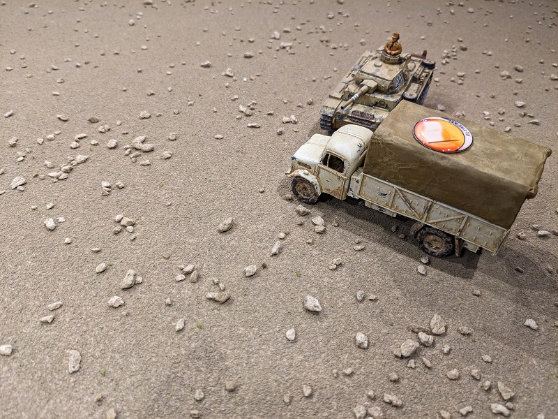 Sepp Borenhaas knew when he signed up for the army that the possibility he'd be shot at was a real one, but as a staff sergeant in the supply arm it was a blessed rarity. Sure, he'd been strafed on occasion by Italian or German aircraft, but for the most part the job was pretty safe all things considered. Not so today. Today was utter chaos. He had an entire section of clerks helping him try to get everything loaded onto trucks, and unfortunately their own transport was in the direction from which the Germans were coming. Getting as much gear as they could into the waiting vehicles, he was especially keen to get the ammo carrier moving - he didn't want to be standing nearby when a trailer filled with an alarming number of artillery shells took a stray round and cooked off. Just then someone yelled, "Panzers!" and he looked up to see several German tanks approaching. Gesturing to his clerks and porters to get down, he yelled at the nearby truck drivers to get moving. The driver of the supply truck didn't need to be told twice. Probably for the best, as Sepp saw a swirl in the dust as a high-velocity tank shell hurtled through the air where the vehicle had been mere seconds before. But the man driving the ammo carrier was clearly panicking and having trouble. Sepp could hear gears grinding as the vehicle lurched a short distance and stalled.