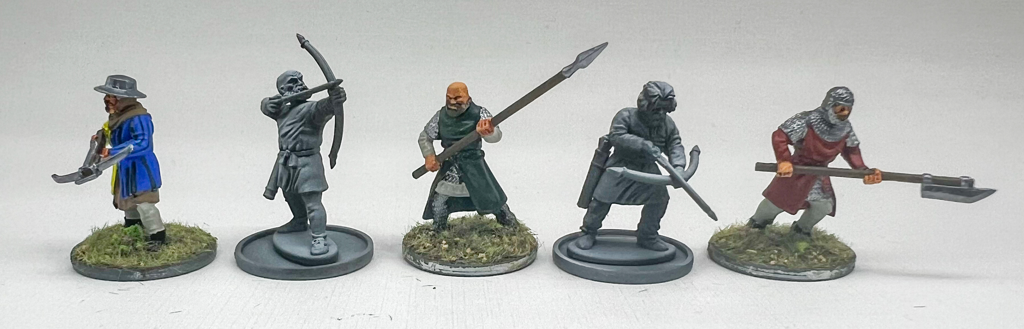 Painted models Wargames Atlantic Foot Serjeants, greyscale models Victrix Dark Age Archers. Credit: Matt JettThe Wargames Atlantic serjeants are noticeably smaller than the Victrix models I have, to the point that I’d be hesitant to combine them in an army. They look good next to the Wargames Atlantic Werewolves kit I reviewed in the past, and should look good with any more “realistic” scale 28mm monsters. If you wanted to buy these to use as a town militia for a D&D game or something like that, they’d work well.