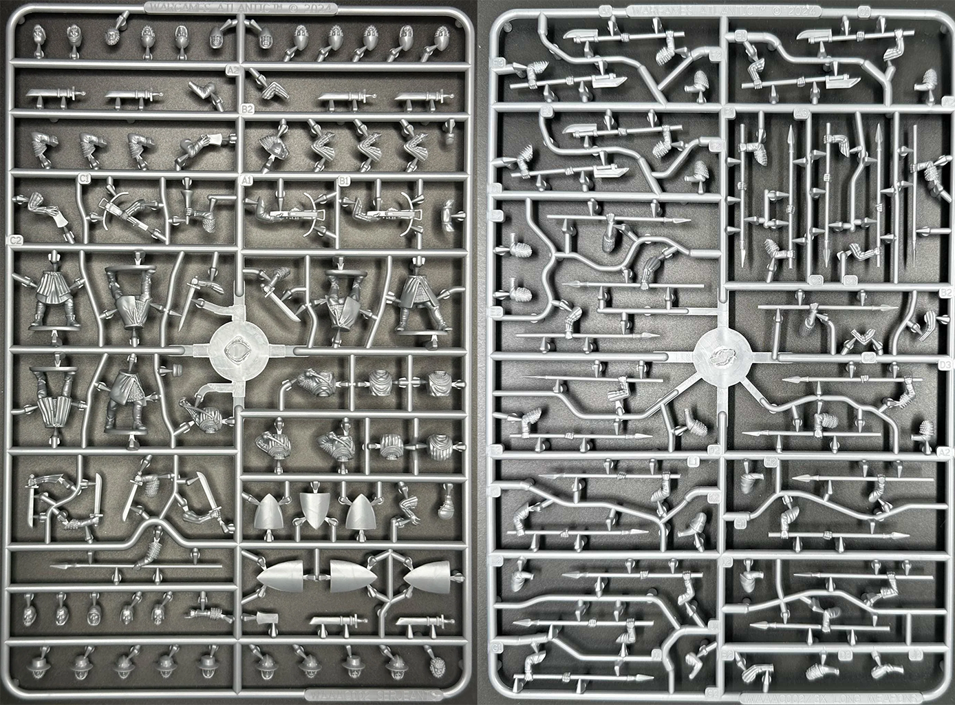 The main sprue and the spears sprue. Image Courtesy of Wargames AtlanticThis works out pretty well for the most part, but you’ll need to do some planning to get the most out of the sprues. Each sprue comes with 4 bodies that have the shield arm molded in, and four that don’t. While this allows you to get a lot more poses out of your shield-carrying infantry, it limits your options as far as using two-handed weapons goes.