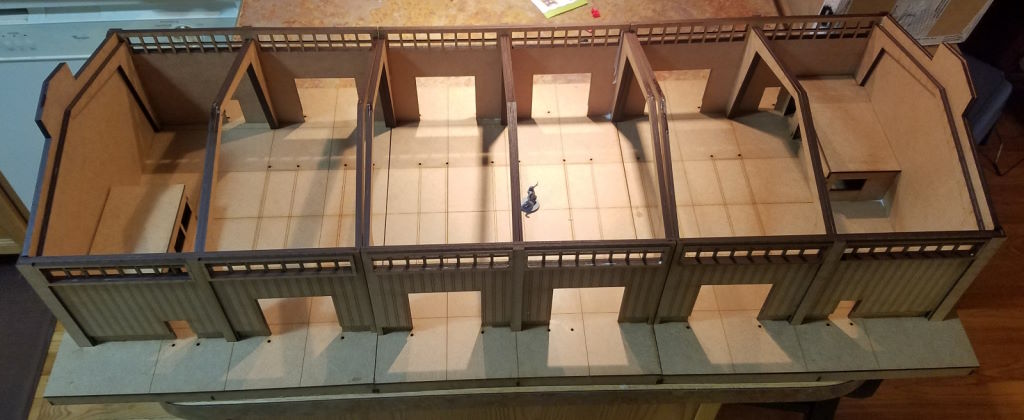 The Dockside Warehouse by Phalanx Consortium. Painted by Michael O "Mugginns"Here’s the entire building assembled without the roof. You can see my tiny guy right in the middle for a sense of scale. The way I put it together, the buildings don’t go together 100% perfectly flush but I’m not bothered by it. MDF warps a bit and glue doesn’t always hold right at the same spot so it happens.