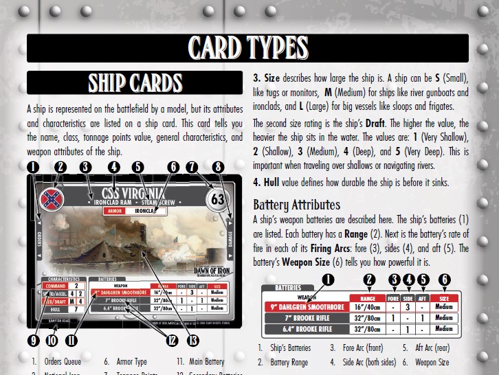 Dawn of Iron rules - card chartEach ship will have a card that shows their key characteristics and guns available. It'll tell you if it's an Ironclad, Tinclad, Timberclad, Cottonclad, or Wood. These types are available when it comes to damage against each ship. I went into more detail in my previous review - but for this one I'll say the Command characteristic is an interesting differentiating factor. Each turn you assign a command card to each ship.