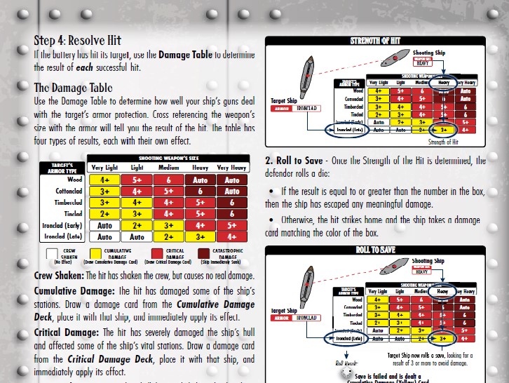 Firing is rather simple - you fire each gun individually (the author mentioned that the players should get a 'feel' for the independence of each gun). There are a number of factors that will influence the number of dice rolled, but you start with 4D6. 5s and 6s hit the target. The target can then try to deflect the hits - for ironclads, you can deflect medium guns on a 4,5,6 and for tinclads you an deflect on a 5,6. Ships take critical damage as they reach or pass through a multiple of 5 hit points.