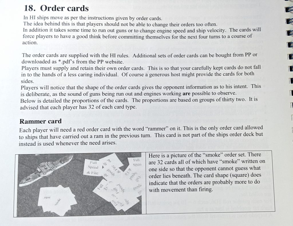 Hammerin' Iron glossary.When a ship arrives on the table the owning player selects five order cards for it. You put the orders in a stack and may look at them, but they stay with that ship. The deck of orders you have is only 32 cards, so each ship will have five of those when it starts on the board. This means that you may have orders that you don't wish to have in there for that ship at a certain time - but you have to use them, representing communication failure or mechanical issues. That's friction, folks! Once a ship only has one card left you can re-do the stack.