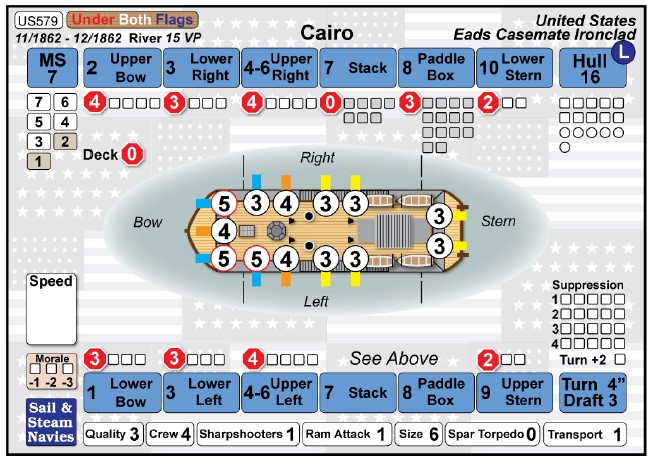 This might be the strongest part of S&SN. There are log sheets (ship cards, basically) for 768 US ships, 211 Confederate ships, and 28 auxiliary selections. If there is a ship you read about once in a letter from your fifth great uncle then it is likely here. The ship logs are gorgeous, too. They have a diagram of the ship, boxes to mark off for damage (I'd recommend laminating the cards and then using a water erase marker), all the details of where it served, and gun values. They're amazing.