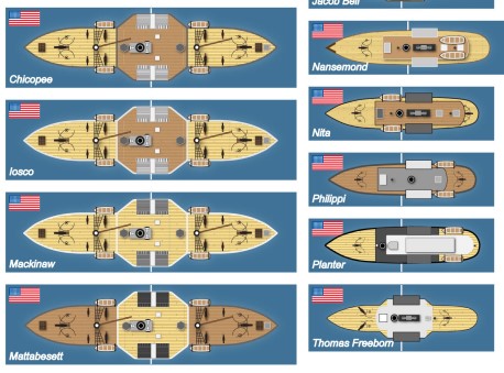 Shooting is easy - it takes into account ship size and silhouette (monitors are lower to the water, so they are harder to hit), range, ships being stationary, and other factors like fog etc. Ships get a chance to save if its possible (shooting a wood boat with a very heavy gun won't allow a save). Getting closer or further away modifies the save as well, simulating the power of a cannonball when closer.
