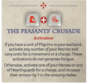 - What they're good at: The Crusaders are, as the name might suggest, a great starter faction in this book. They're good at everything without completely excelling at anything - they can shoot well, they can fight in melee well and they can soak up damage. The Levantine subfaction is possibly the more complex of the two; you're rewarded for having a unit of Pilgrims (Levy) in your warband, and most of your battle board abilities will play differently as long as that unit is still alive. Levantine Crusaders take the archetype of "religious zealots" and translate it to "extreme survivability", so abilities like Blessing of the Righteous mean that your unit can't lose more models than its Armour value (at the point of triggering the ability) - which grants truly superhuman survivability if you use it at the right moment. And abilities like Happy Are the Humble take your Levies and make them hit as hard as Warriors (sound familiar, Anglo-Saxon players?), so you're definitely eating well with Levantine Crusaders. On the other hand, Baltic Crusaders are in a slightly trickier spot now post-FAQ. Whilst they used to be the faction of 'Hearthguard and crossbow Levy' you can only take the one crossbow Levy unit now, which has frustrated a few Baltic players. Nevertheless, the Baltics still hit hard and have a lot of tools up their sleeve, particularly with their Hearthguard.