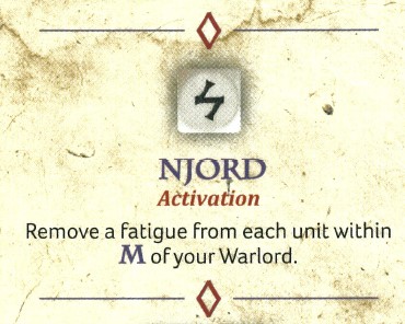 Viking Njord ability. Credit: Studio TomahawkWith three different fatigue removing abilities, the Vikings really want to be moving upfield and using multiple activations to try and remove enemy models and gain objectives. Keep your warriors in a loose formation with your Warlord in the middle at least within M and you can remove a fatigue off of each with Njord. The only downside is it takes a rare icon, which makes it a tough choice, and also that it applies to all units(!), both yours and your enemy!