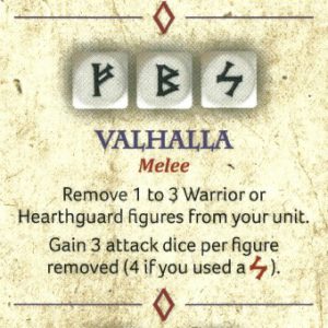 Viking Valhalla ability. Credit: Studio TomahawkIf you're here to paint up an elite warband of hearthguard with some sweet berserkers who are pissed off and not caring a bit about their own personal safety - back up a bit. Vikings are very much rewarded for bringing Warriors, because a lot of their abilities rely on gaining attack power at the expense of decreasing survivability - or even sacrificing their own, as in the case of Valhalla. Here's an example: you've just started a melee, so you first add up your Combat Pool, taking X dice for each fighter, based on their status - one for warriors, two for hearthguard. So eight dice for a unit of eight warriors, eight for a unit of four hearthguard. Then you remove 1-3 models to gain three extra attack dice per guy. Removing two warriors gives you an additional six dice, so 14 total, with six left to take hits. Removing two hearthguard gives you an additional six dice, so 14 total, with two left to take hits. This means Warriors can soak up the extra casualties and still have models left over to fight or hold objectives!
