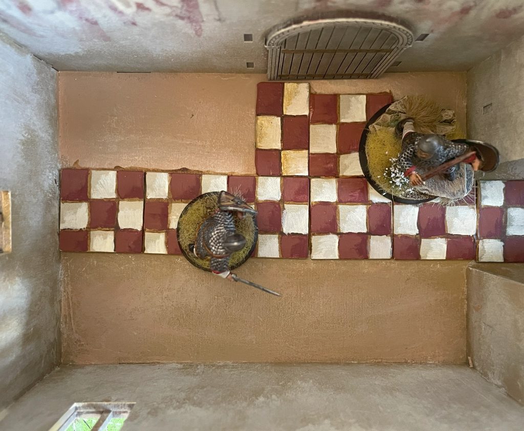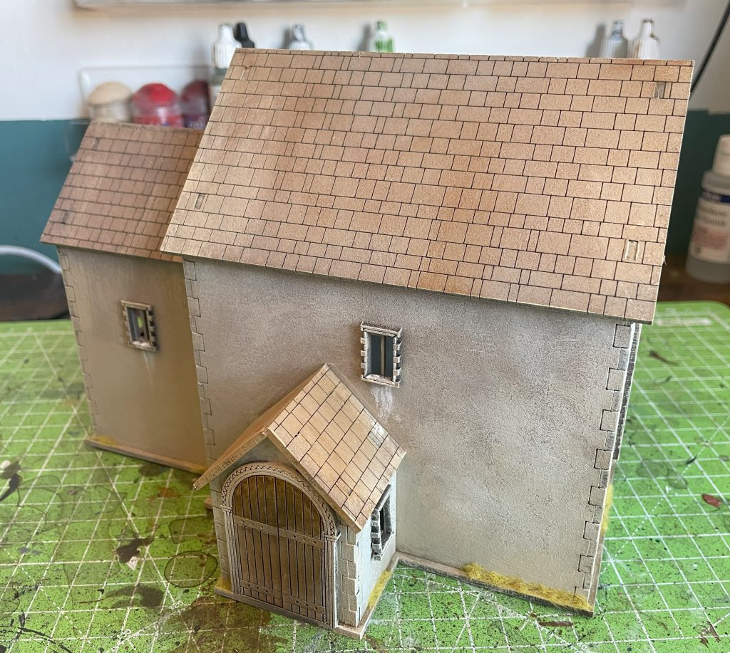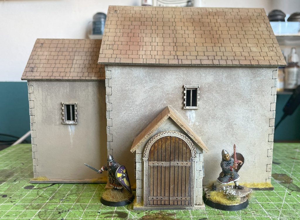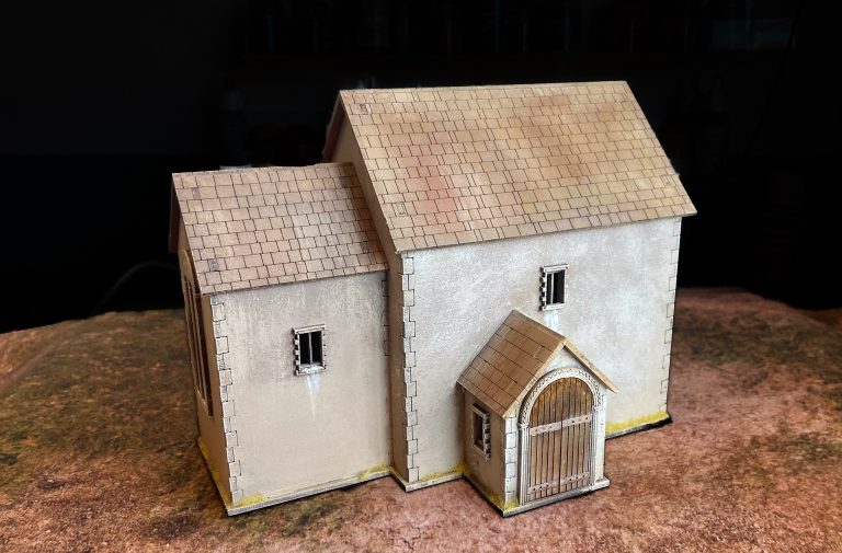 Drybrushing and a bit of wet blending goes a long way. Sarissa Norman Church. Credit: LenoonPainting the church appropriately will really let you take a (wonderfully) generic bit of scenery and theme it appropriately for your table. A very early Saxon church would look fantastic with roman-style white walls and the classic “we really want to project the image of Rome” red tile roof, while later Saxon and Norman construction might have darker clay tile, or even slate, roofs. Local building materials will change the colours as much as fashions, so have a think about the look you’re doing before diving in. Detailing the exterior was relatively simple, adding a bit of faded-looking colour to arches, a bit of pigeon shit on windowsills (tiny blobs of milliput and paint), and some staining around the door and windows with washes. I also added some very simple rows of swallow nests out of modelling clay to the very very edge of the roof over the nave. Adding any more would likely make it difficult to take the roof on and off, but if I wasn’t doing a removable roof I would have gone absolutely crazy with swallow nests and bat roosts.