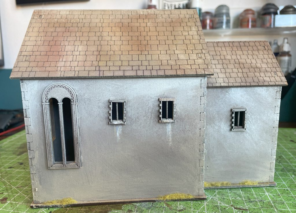 Before diving into this, I always give mdf terrain a very light spray of primer before painting - pretty haphazardly in the most part - which takes off any gloss and adds just a tiny bit of texture. The church will eventually feature in my Village in the East series, but I wanted it to look generic enough to fit in to North Africa, Sicily and even a very hot summer in the UK. I read a couple of sources suggesting Norman and Saxon churches were variously plastered, lime washed, mud-plastered or otherwise smoothly dressed depending on area, so I’ve adopted that rather than trying to paint a lot of stone/flint/block texture onto flat MDF. As a result, painting the exterior was very easy, using my biggest oldest drybrush to layer my Egypt Building colours onto it - up through the light skin tones to white from yellow ochre. The roof tiles received the same with a little extra brown and even less attention to detail. It’s all blended together quite nicely.