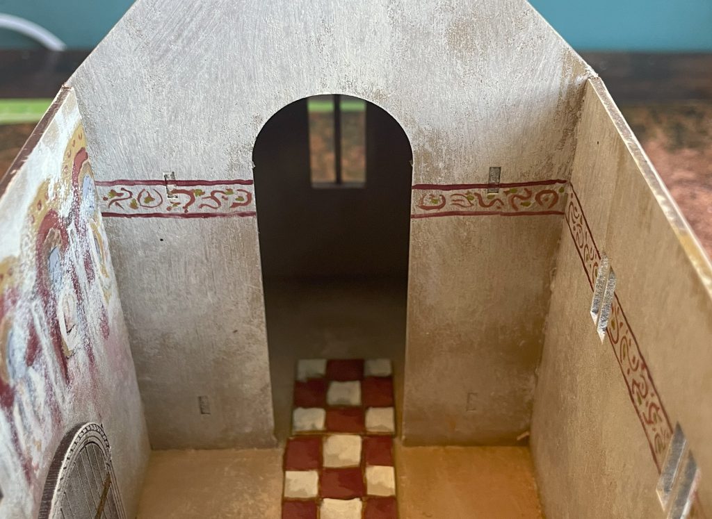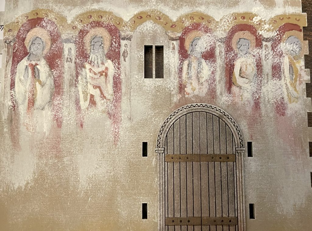 Pseudo Arabic decoration Sarissa Norman Church. Credit: LenoonInterior detailing was much more fun. Keeping the Chancel a bit darker with just two colours on the walls, I thought it would be a good idea to push the Nave decoration a bit more. This includes a band of pseudo-arabic that would suit a Sicilian or Crusader church - mainly because I love the idea of pseudo-arabic decoration when people looked at islamic calligraphy and thought “how beautiful” but couldn’t read the writing so just copied the shapes roughly - and a frieze of saints inspired by Romanesque art. These churches would have been richly - if not always expertly - painted, and with a large flat space and the saving grace of the weathering sponge, I felt that it would have been rude not to.