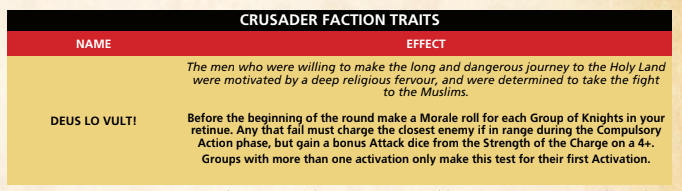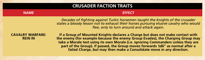 Fresh off the boat (or march) - your Crusaders hit hard on the charge but.... Credit: FootsoreI’d like to highlight a small but important example, the Settled Franks “Rein in” ability. This is a little thing that says a lot (always love this in a ruleset) - Settled Franks, the Western culture that arose in the levant after the first Crusade, can effectively call off a charge if it fails. Charges against highly mobile, evasive Islamic cavalry will fail occasionally/often. Being able to reposition instead of flailing around with your metaphorical arse hanging out is a powerful ability - one that the Crusader list representing forces new to the Levant don’t have, as shown above. It shows a level of adaptation to local warfare that speaks to the acclimatisation, acculturation and diplomacy that existed between the Crusader states and their Islamic neighbours. Settled Franks know how to fight mobile cavalry, because they’ve been doing it a long time - sometimes even alongside Muslim armies. For a two-line rule, that’s a clever bit of work, going above and beyond to show the complex, lived reality of the Crusader states.