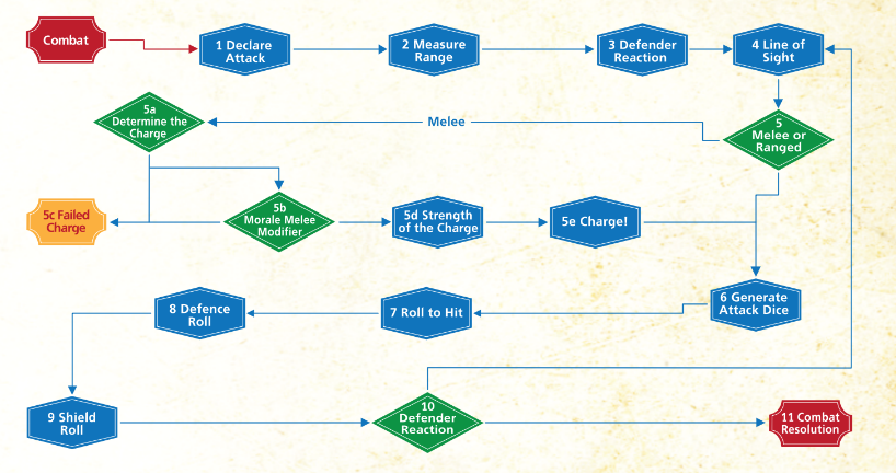 The answer to rules layout issues is FLOWCHARTS. This is a lovely one in the core book, making combat very simple. Credit: FootsoreThe final thing is one of the eternal bugbears of Historicals games and that's rules layout. There's some odd choices as to where core rules are put, like abilities are split into point-buy and inherent (but stat blocks for units don't tell you which is which), Morale-related checks are split across several sections, and the rules for Command appear in the middle of the army lists. On a first read this was a little confusing, but at least compared to many other books on a second read it all made sense.