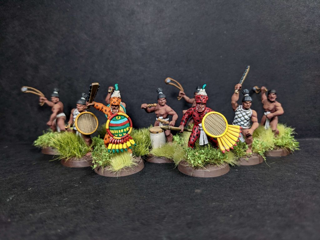 These are the low-status warriors, those who have taken a single captive in battle. They are allowed to wear the padded jerkins as armor, carry shields, and wield the fearsome macauhuitl. That's a big step up from going into battle with nothing but a loincloth and a spear! (credit: Ilor)This process can actually be split into two main parts - one that happens once and one that can happen again and again. We split these into two actions - Challenge (where the models face off and then meet in combat) and Fight (which happens automatically after a successful challenge but then might keep happening).