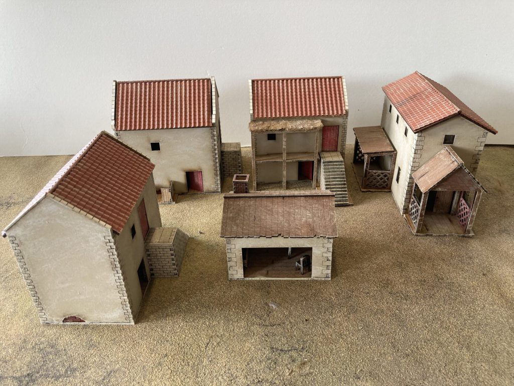 Spanish style houses from Empires At War.I grabbed these houses from Empires at War to make a small town and they went together really nicely. They're pre-painted except for the roof - I did a small wash and drybrush and they look awesome.