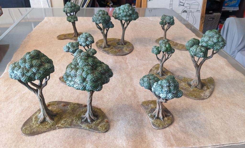 Canopy trees by Rocket Pig Games. 3d printed in plastic by my buddy.I wanted different trees to show a different locale, but also because I was tired of the flocked trees falling apart. These are entirely FDM plastic, nicely printed with minimal gaps to fill. I glued mine together so they can stay together forever but you can take them apart if you wish. The design is here. Along with these I got a bunch of bushes printed to kinda simulate the chaparral in Mexico and give a little bit of scatter.
