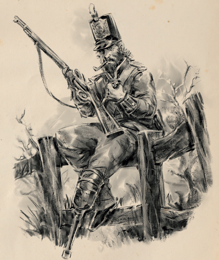 Is there anything more hardcore than a peg-leg Napoleonic soldier smoking a pipe scratching kill-marks into the stock of his musket? Credit: Braingbug Design