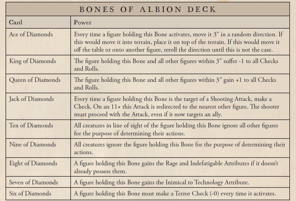 There are eight scenarios in the new Bones of Albion campaign. The first seven scenarios include a Bone of Albion as one of the clue markers that you can pick up. Models carrying a bone move slower, aren't as great in melee, and can't shoot. If you have a Combat Engineer they're actually better at carrying the stone, which is neat as hell, giving you more of a reason to take a model like that. There is also a really neato optional rule for providing special rules to the person carrying the Bone of Albion during a scenario.