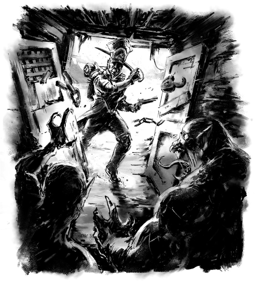 Art from The Silver Bayonet. Credit: Brainbug DesignThe Silver Bayonet is a gothic horror game - you paint up a unit of specialists who have come together to form units called Silver Bayonets - to fight off vampires, zombies, ghouls, ghosts, etc. It's very much grounded in the Napoleonic Wars while still allowing room for the horror stuff. It's X-Files for grogs.
