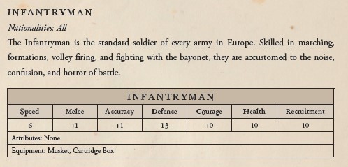 Example stat box for an Infantryman. Credit: Osprey GamesEach officer has 100 (or 105 if you choose that upgrade) points to choose soldiers to fight with. The rules limit you to seven soldiers plus an officer (the North Star warband packs come with eight minis, conveniently) and recommend you always start with this number. Each soldier can then choose one (sometimes two depending on specialty) piece of equipment from the Special Armoury. In the main rulebook there are 24 soldiers ranging from an Infantryman to a Werebear. The Carpathians adds three more and Canada adds three more for a total of 30 soldiers you can choose from.