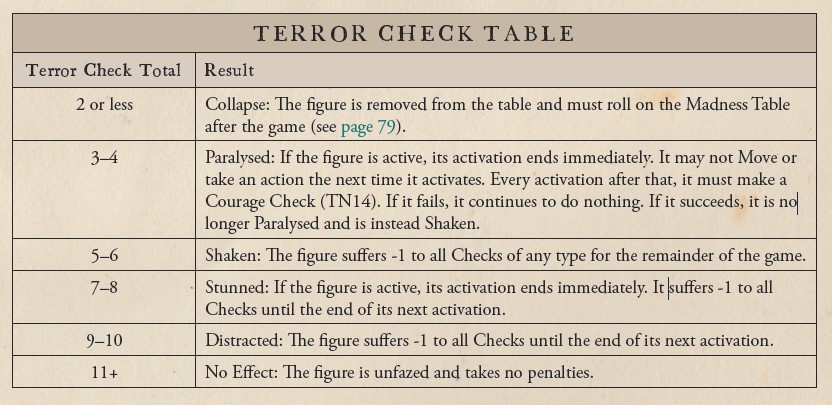 As an example, Gauthier (a French grenadier) has discovered the mutilated corpse of a local clergyman behind a dung heap in the barn of a great farm house. The eyes have been cut out and his heart has been eaten. Gauthier has to take a terror check (-3) or suffer a result from the Terror Check Table. In this instance, the -3 subtracts 3 from his courage stat of 2 so his overall check is done at -1. He rolls an eight net, and receives the result.