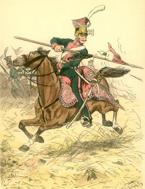One possible interpretation of the Intermediate Lancer UniformIt was replaced with a much more utilitarian – and cheaper – Chasseur style uniform, with the single breasted jacket, this time in the fairly standard French green, though pink crept in with the trim on the habite-veste and the collar. It's difficult to find out how long the Lancers had this uniform for - in fact it's likely that this was their uniform for a brief period and only for those squadrons reinforcing their regiment in Spain. It seems like quite a fleeting thing, or possibly even an invention of uniform-obsessed historians trying to rationalise the very confused uniform logistics situation between the various fronts, wars and phases of the period.