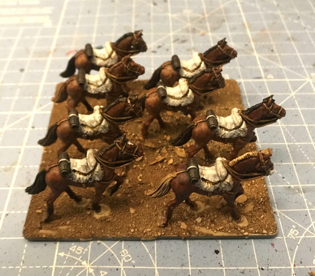 If there's a knack to painting horses well, I don't have it. Luckily, a simple base colour followed by a suitable contrast wash gives me enough detail on the horse itself that I'm happy with it. The green uniform is a combination of Army Painter Witch Brew and Astra Militarum Green Contrast paint to knock it a little darker and thin it out at the same time, then highlighted up with the Witch Brew. I went a little brighter than the dark green I've used on my Flanquer-Chasseurs and in the images above to represent those uniforms being at the very end of their usable lives, faded from the sun and with heavy staining.