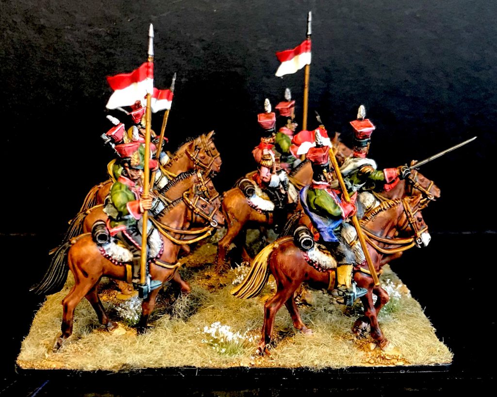 Victrix Guard Lancer. Credit: ThundercloudThe Warlord Line Lancers it was. They’re in the right uniform on top – double lapels and high collar – and conveniently already come with lances and their horse accoutrements are right for the Berg Lancers. The heads were the only immediately obvious issue, but the Warlord Vistula Legion Greandiers in Czapkas provided an acceptable alternative.